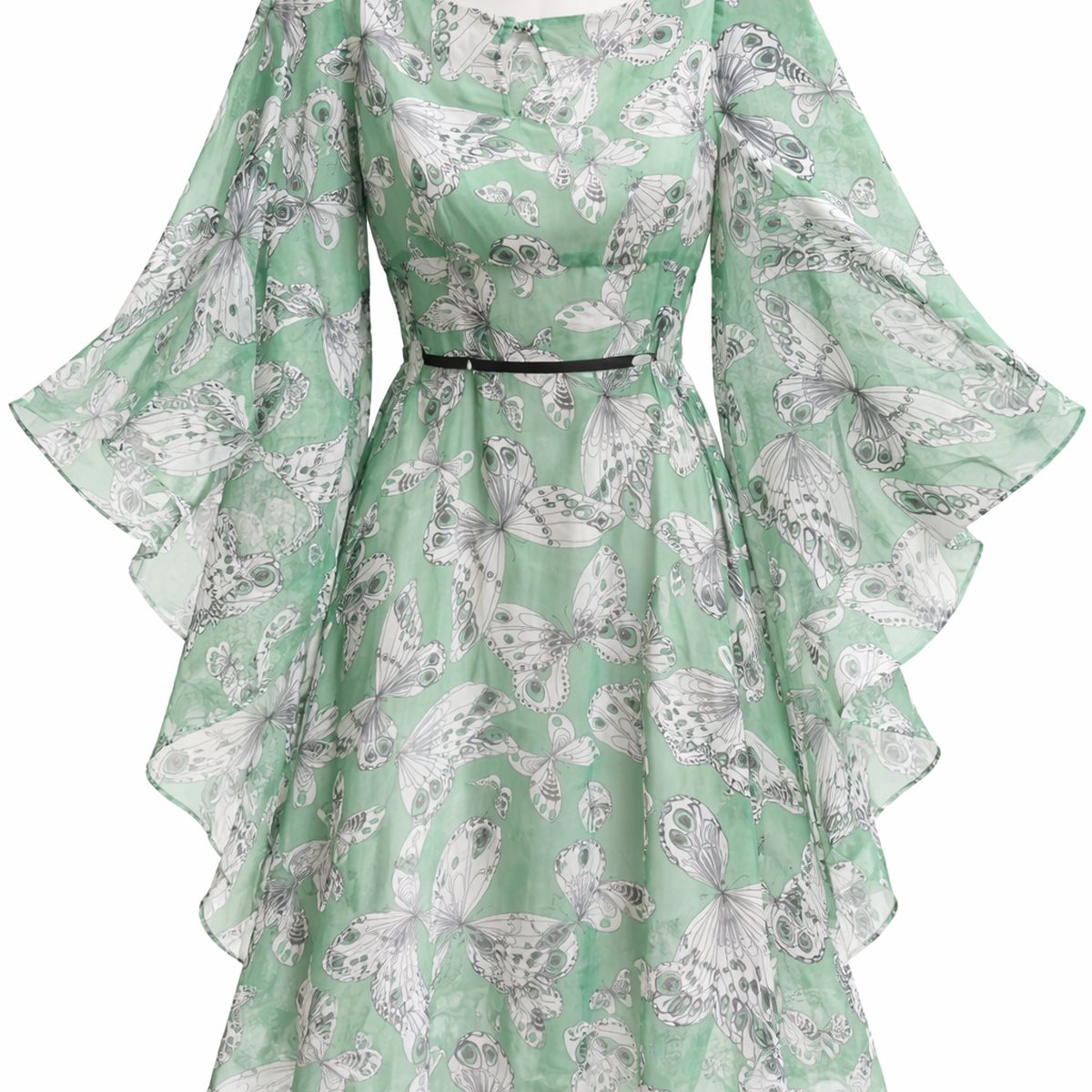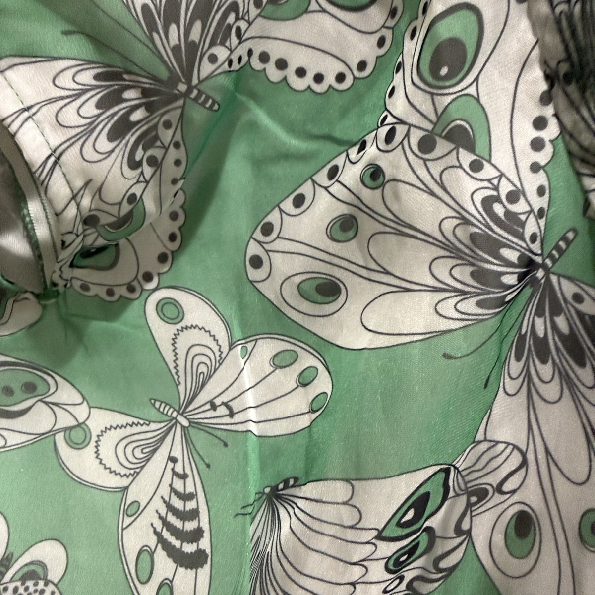 Beautiful Small Parlour dress in Size Small (standard sizing — not petite). This elegant green dress features a delicate butterfly print and soft, flowy kimono-style sleeves that open gracefully for a feminine, airy look.